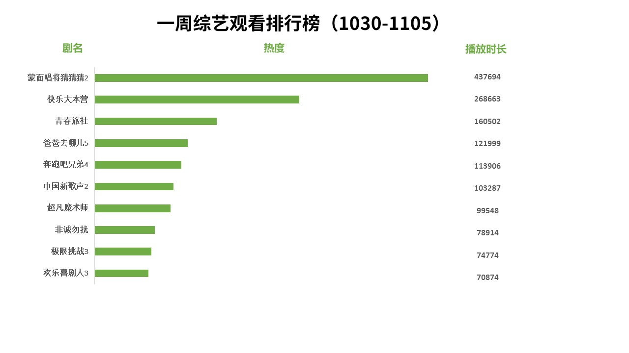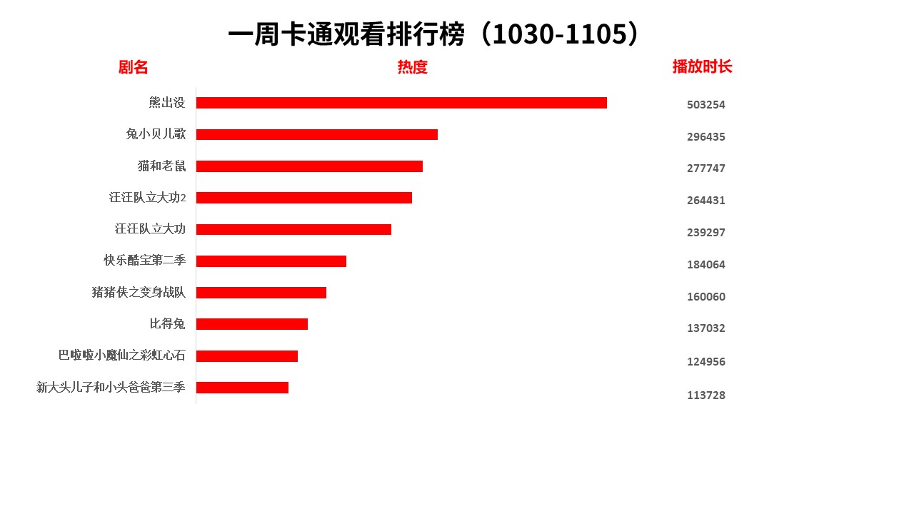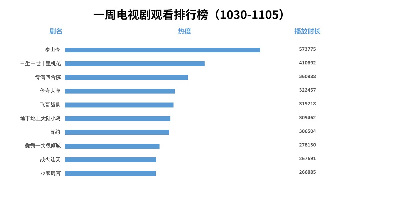 新聞來源:宏輝智通 發布日期:2017-11-09 瀏覽次數:2920廣東IPTV發布IPTV10月30日-11月5日電視劇、電影、綜藝、卡通節目觀看排行榜。電視劇觀看排行榜前三位是《寒山令》、《三生三世十里桃花》、《情滿四合院》; 電影觀看排行榜前三位是《戰狼2》、《熊出沒之熊心歸來》、《冰雪奇緣》;綜藝觀看排行榜前三甲《蒙面唱將猜猜猜2》、《快樂大本營》、《青春旅社》;卡通觀看排行榜前三位是《熊出沒》《兔小貝兒歌》、《貓和老鼠》。