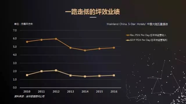 仔細分析,中國五星級酒店經營收入持續下行直接導致了低迷的坪效業績。過去7年,中國五星級酒店的經營收入與毛利業績總體呈現負向增長,年均分別下滑1%和4%。供需嚴重失衡是業績下滑的最主要原因,而供需失衡的主要原因便是之前提及的政府主導的非市場化開發模式。如果真正按照投資回報的商業邏輯考量酒店開發,相信有相當數量的酒店根本不會出現。再者,中國經濟增速放緩及“八項規定”出臺促使市場客源結構從政商消費轉變為大眾消費,也對市場業績構成負面影響。