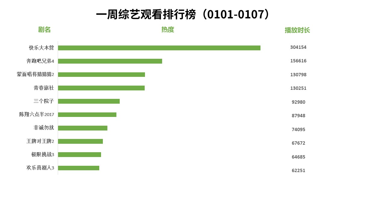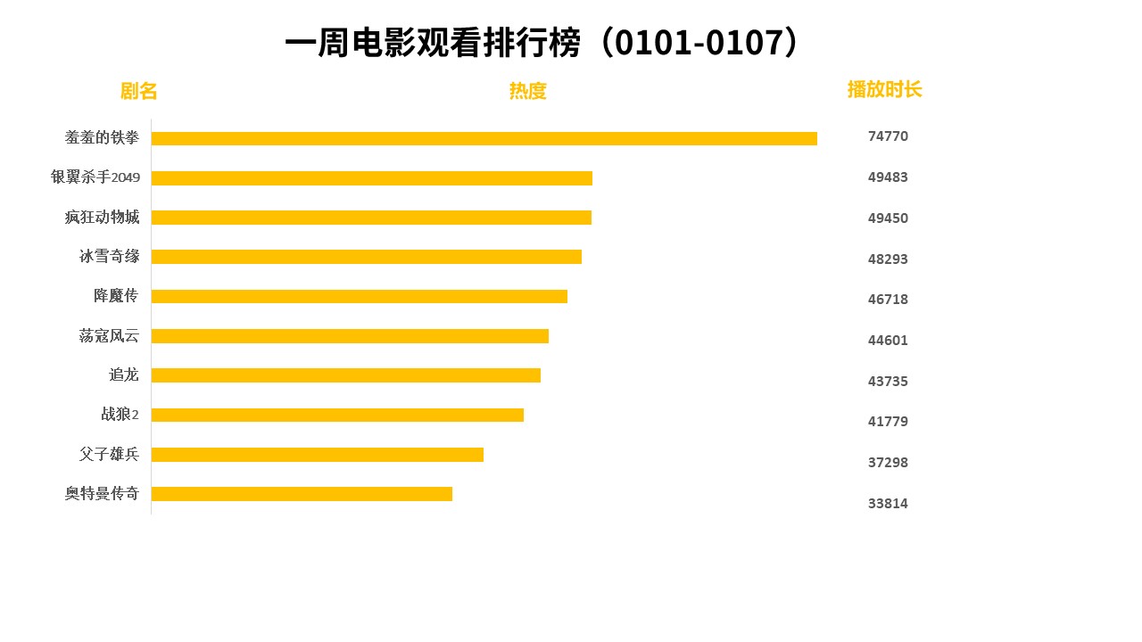 新聞來源:宏輝智通 發布日期:2018-01-18 瀏覽次數:3110【流媒體網】消息:廣東IPTV發布1月1日-1月7日電視劇、電影、綜藝、卡通節目觀看排行榜。電視劇觀看排行榜前三位是《后宮·甄嬛傳》、《蜂鳥》、《瑯琊榜》; 電影觀看排行榜前三位是《羞羞的鐵拳》、《銀翼殺手2049》、《瘋狂動物城》;綜藝觀看排行榜前三甲是《快樂大本營》、《奔跑吧兄弟4》、《蒙面唱將猜猜猜2》;卡通觀看排行榜前三位是《熊出沒》、《兔小貝兒歌》、《汪汪隊立大功》。