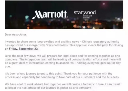 2016年9月20日,萬豪國際發表聲明稱,中國商務部已經批準其收購喜達屋酒店及度假村國際集團的交易。