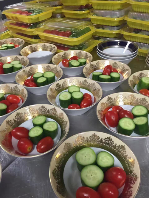 菜單確定后,酒店餐飲部各司其職,進(jìn)入緊張的工作狀態(tài)。9月3日定制食材,9月4日進(jìn)行食品加工制作。在時(shí)間緊迫的情況下,卻又突生小狀況,酒店于9月4日下午1時(shí)臨時(shí)接到沙方消息,原定于5日下午5時(shí)左右從杭州蕭山機(jī)場起飛的航班,臨時(shí)調(diào)整至5日上午10時(shí)30分,這對(duì)酒店來說意味著又減少了近7小時(shí)的制作時(shí)間。為了能順利完成此次任務(wù),酒店召集了廚房部門所有同事,60余人進(jìn)行通力協(xié)作,8小時(shí)的不眠不休,終于在5日凌晨1時(shí)將1104份航空餐全部打包裝箱進(jìn)入運(yùn)輸車,在機(jī)場指定時(shí)間內(nèi)保質(zhì)保量將航空餐送達(dá)機(jī)場。