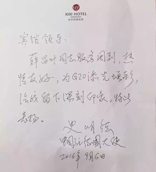 西溪賓館總經理還說到,在送別23位大使及各部委領導之時,每一位賓客都贊美了酒店優(yōu)美的自然景色,感謝每一位員工對他們的細心照顧,讓他們住得十分舒心。多位大使表示,希望有機會還能來到杭州西溪賓館休息或度假。酒店收到了多封表揚信及感謝信,客房部的薛昌葉還收到了駐德國大使的表揚,表達對其工作的肯定,贊她為G20添光增彩!