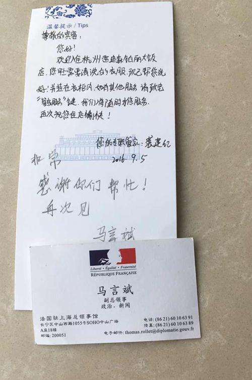 除了在店內留下的感謝信、感謝留言之外,外媒記者離店后還專門向酒店發來感謝郵件,其中有法國駐上海總領事館副總領事Thomas ROLLET(馬彥斌)、德國駐京記者一處資深記者陳女士、香港鳳凰衛視新聞制作部郭女士等。