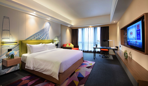 例如在客房的設計上,沿用希爾頓歡朋國際標準的“Hampton Bed®”的同時,床背板以及洗手間門板的裝飾畫均選用了當地地標建筑的藝術化作品。在整體設計的色彩運用上,國內的希爾頓歡朋酒店的色彩更加繽紛、明亮,給客人一種現代時尚的感覺。