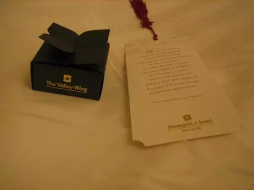 每家香格里拉酒店的床頭柜里都會有一本《消失的地平線》這已經(jīng)不是秘密,這也是香格里拉集團(tuán)的拳頭理念。在靜安香格里拉,還會夜床拆口處放置一枚香格里拉書簽(書簽文字摘自《消失的地平線》),給賓客帶去平靜悠遠(yuǎn)的感覺。