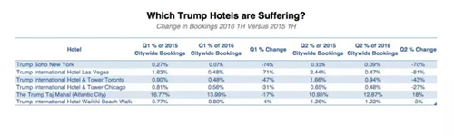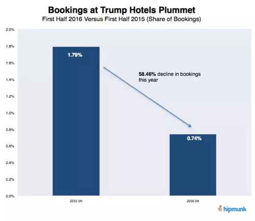 據(jù)美國旅游搜索網(wǎng)站Hipmunk統(tǒng)計,2016年上半年全美的特朗普酒店預訂數(shù)量的市場份額同比減少58%,可以說是暴跌。該網(wǎng)站的用戶多為城市地區(qū)的年輕人,似乎在特意避開特朗普品牌。