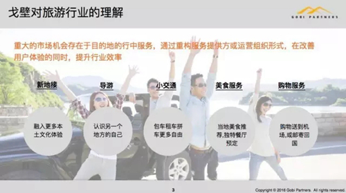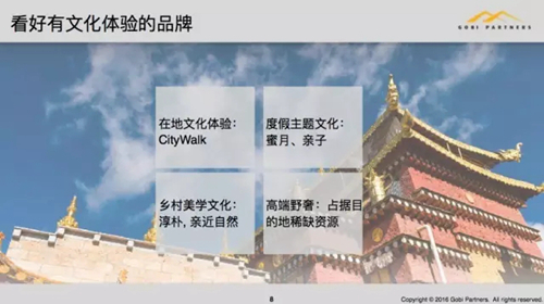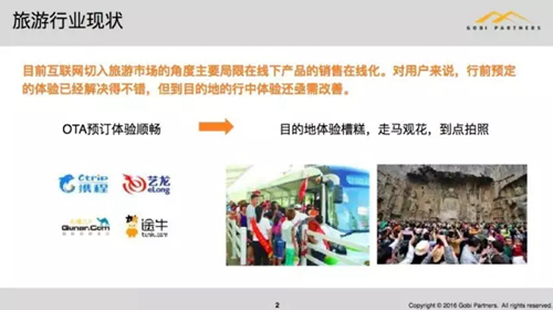 這是我們認為現在整個旅游行業的現狀,攜程可能有快15年了,整個和互聯網相關的旅游行業,大家主要在做的都是把線下品牌的銷售在線化,從消費者的體驗來看,其實你預定的流程體驗已經解決得不錯了。不管你現在去攜程下面的哪個品牌OTA,或者像途牛、同程之類的,其實我覺得都解決得不錯,但是到目的地的體驗我們覺得還是有待改善的,這是整體對旅游行業大的看法,所以也會導致我們投資策略的一些變化。