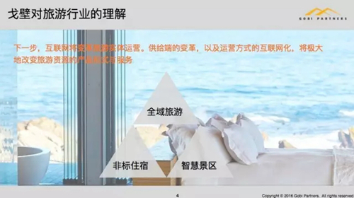 首先感謝主辦方給我這么一個機會跟大家交流一下,作為一個早期創投我們是怎么看非標的美宿品牌。先簡單介紹一下戈壁,其實我們是比較標準的互聯網創投,主要是做早期A輪的項目,之前也是互聯網相關的項目做得比較多。我們也和旅游有一些淵源,我本人很偶然加入了VC行業,之前是負責藝龍網站的。第一個公司投的是途牛,所以和旅游有比較大的淵源,我們對旅游行業也是做了一些分析,也是今天和大家共享一下我們的觀點和看法。