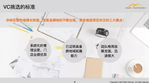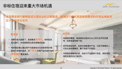 下面講一下非標住宿,我們對非標住宿一個大的需求理解,就是整個旅游的或者度假的需求,我們說旅宿需求將取代商旅,其實商旅和度假還是有蠻多需求上的不一樣,所以會導致一撥新的機會。我們的理解是基本上度假和商旅是7:3的關系,08年的時候大概是3:7,現在我自己的感覺是5:5,所以我們整體投資雖然在旅游大概有十幾家公司的布局,都是和休閑旅游相關的,商旅我們看得比較少。