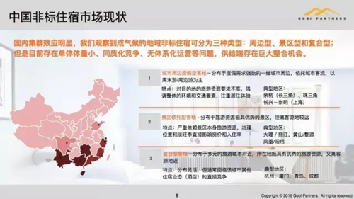 這是自己做的,我們的一些看法不一定對,我們把它大概分成了三種,周邊、景區和復合型,我們覺得整個非標住宿的單體體量是比較小的,杭州是非常典型的一塊。我們認為整個民宿端、供給端有巨大整合的機會。