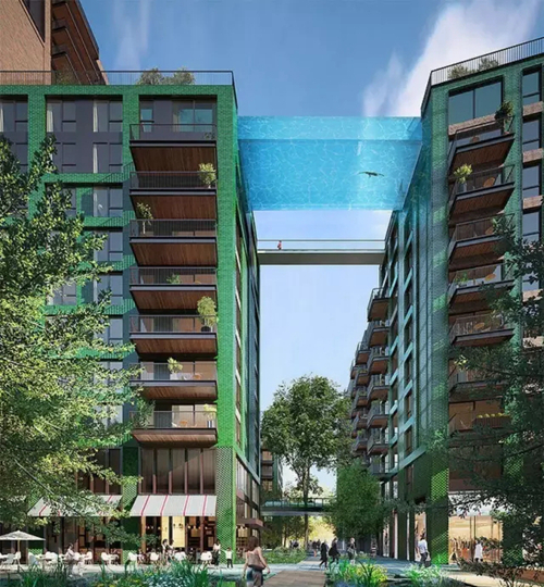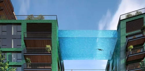 這個通體透明且無結(jié)構(gòu)的泳池被稱為“SkyPool”,坐落在倫敦泰晤士河岸新區(qū)、巴特西發(fā)電廠旁邊,高懸在10層樓之上,長約27.4米,高約33.5米。