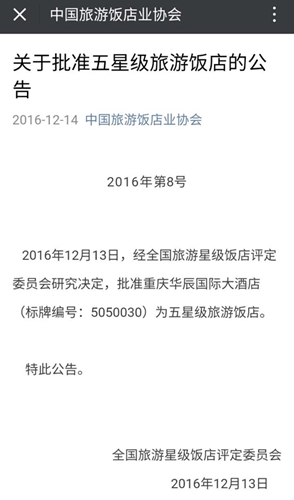 2016年12月13日,全國旅游星級(jí)飯店評(píng)定委員會(huì)發(fā)布公告,經(jīng)研究決定,批準(zhǔn)重慶華辰國際大酒店(標(biāo)牌編號(hào):5050030)為五星級(jí)旅游飯店。