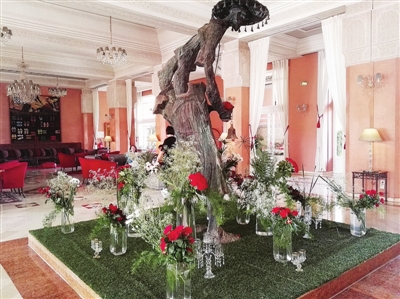 馬拉喀什的東方文華酒店,簡直就是一座花園。這家酒店給記者的印象是以白色、綠色為主調(diào)。餐桌布是白色的,上面擺放著新鮮的結著橄欖的枝葉和黃的綠的檸檬,雖然北非正午的日頭又毒又烈,但在白色的遮陽傘下,這清新的顏色,加上不遠處碧藍的池水,心立馬靜了下來。可能是受摩洛哥傳統(tǒng)建筑的影響,一進門,大廳中央一定是一池水,圍繞著池水就餐。因而我們在文華和四季酒店用午餐時,都是在室外,離游泳池不遠。雷迪森酒店的室外就餐區(qū)也在泳池旁邊。文華酒店的客房是別墅型,每棟與每棟之間種滿了各種綠植,仙人掌最多,就像進了植物園。每棟房子的墻頭爬滿了五顏六色的花朵,伸手可觸,更設計了幾處鮮花肆意招展的甬道,惹得我們紛紛拍照,竟一時忘了這里是酒店。
