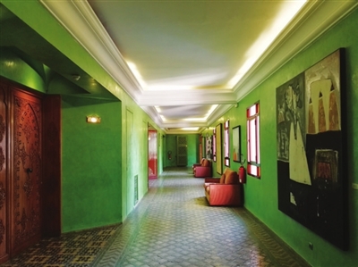 如果比較摩洛哥的國際品牌和本土品牌,感覺本土品牌在色彩運用上更多樣少禁忌,許是摩洛哥早年歸屬法國又離西班牙近,受法國人的浪漫和西班牙人奔放的民族性格影響,雖全民信仰穆斯林,但宗教并沒有限制他們對美的追求。在參觀本土品牌SAADl酒店的客房時,記者看到每一層使用的顏色不同,一會兒全層都是藍,一會兒全層都是綠,那藍那綠上還精雕著細致的粉的白的花紋。從樓道到房門到房間,就算見多識廣的記者,也驚嘆不已,真是佩服設計師,簡直是肆無忌憚呀!樓道是深湖藍色,墻上掛著的大幅畫作主調(diào)是藏藍色;粉色墻面房門卻是綠色的。身陷色彩之中,越看越覺得生動,和諧,高雅。