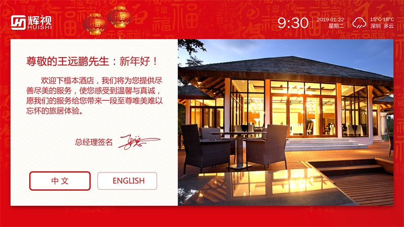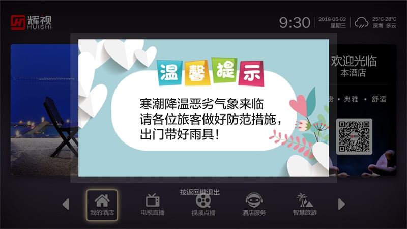 節(jié)日祝福:系統(tǒng)與酒店管理系統(tǒng)(PMS)等進(jìn)行無縫對接,通過TV終端自動(dòng)為客人送來溫馨節(jié)日/生日/紀(jì)念日文字祝福,同時(shí)自動(dòng)場景界面換膚,附加動(dòng)畫渲染效果,讓客人倍感溫馨的關(guān)懷、賓客如歸的感覺