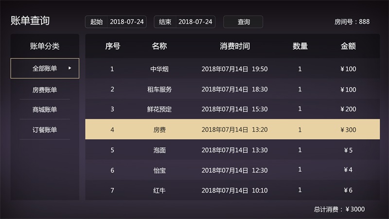 綜合查詢:系統(tǒng)對用戶本次入駐所有消費(fèi)記錄清單記錄查詢,包括房費(fèi)、餐費(fèi)、購物、娛樂項(xiàng)目及費(fèi)用查詢;